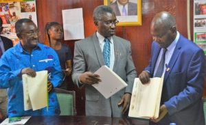 De gauche à droite : DR OWUSU AFRIYIE AKOTO (ministre de l’Alimentation et de l’Agriculture), PR KWABENA FRIMPONG BOATENG (ministre de l’Environnement, de la Science, de la Technologie et de l’Innovation) et DR EPHRAIM MUKISIRA (Président du Conseil d’administration du FARA)