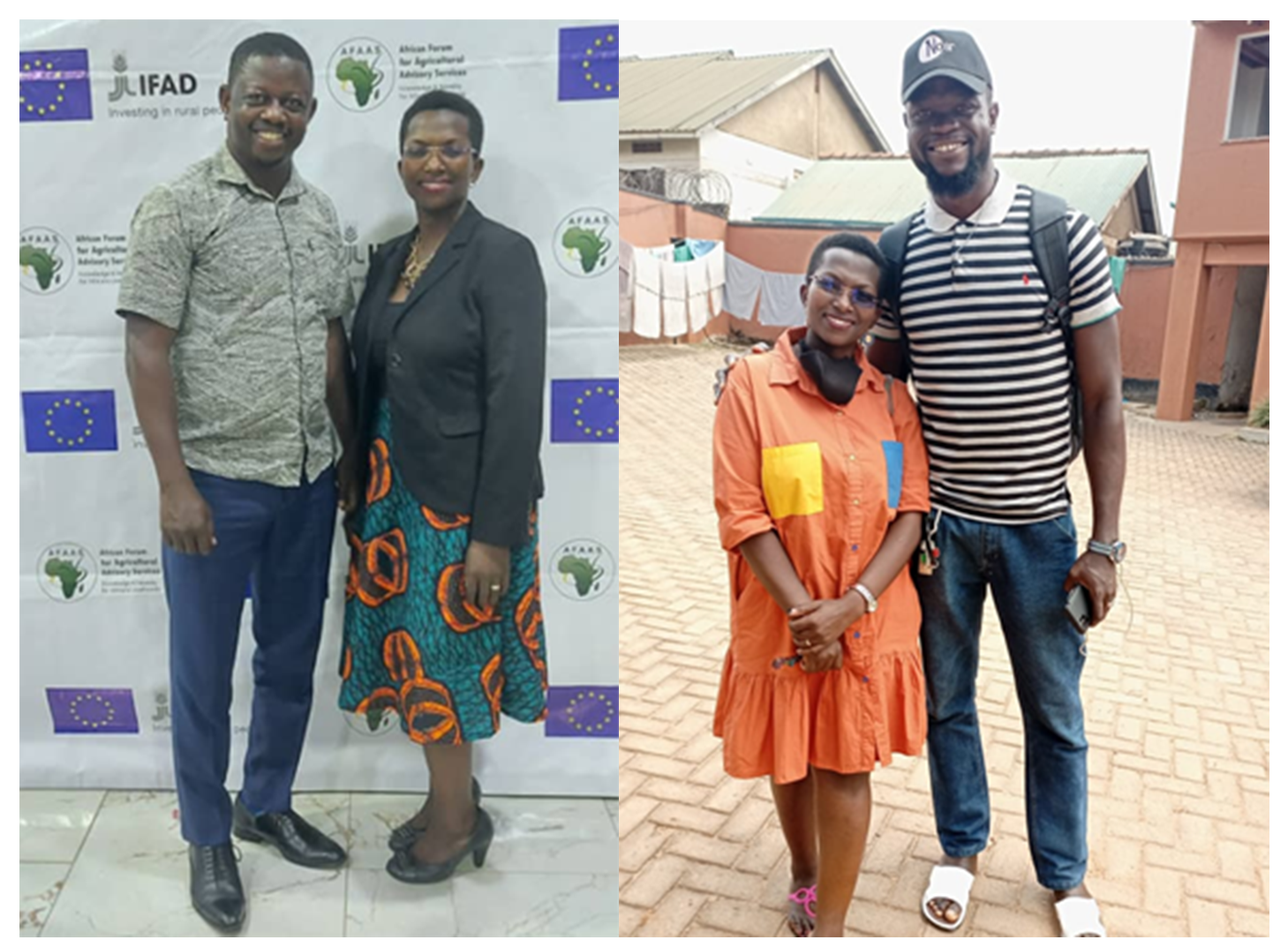 Ci-dessus (à gauche) : M. Benjamin Abugri et Elizabeth lors de la réunion du FARA-AFAAS sur l’interopérabilité des systèmes de gestion des connaissances et de MEL ; (à droite) : Elizabeth et Marc Bappa du Cameroun lors de la Semaine africaine de vulgarisation agricole organisée par l’AFAAS à Kampala.