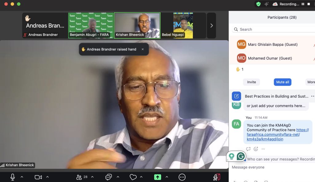 One of the session’s highlights was a presentation by Benjamin Abugri, KM, Digitalisation and Learning Lead at the Forum for Agricultural Research in Africa (FARA) and Facilitator of the KM4AgD CoP. Drawing from field experiences and community engagements, Benjamin presented six practical ingredients for building and sustaining successful Communities of Practice. These included: setting clear goals, establishing a learning plan, assigning a moderator or facilitator, using social media and forums for communication, equipping members with collaboration tools, and supporting emerging communities to maintain momentum. He illustrated how these components have been applied within the KM4AgD CoP to strengthen participation and impact. “By nurturing emerging communities,” he noted, “we spread innovation and sustain momentum within our knowledge ecosystem.”