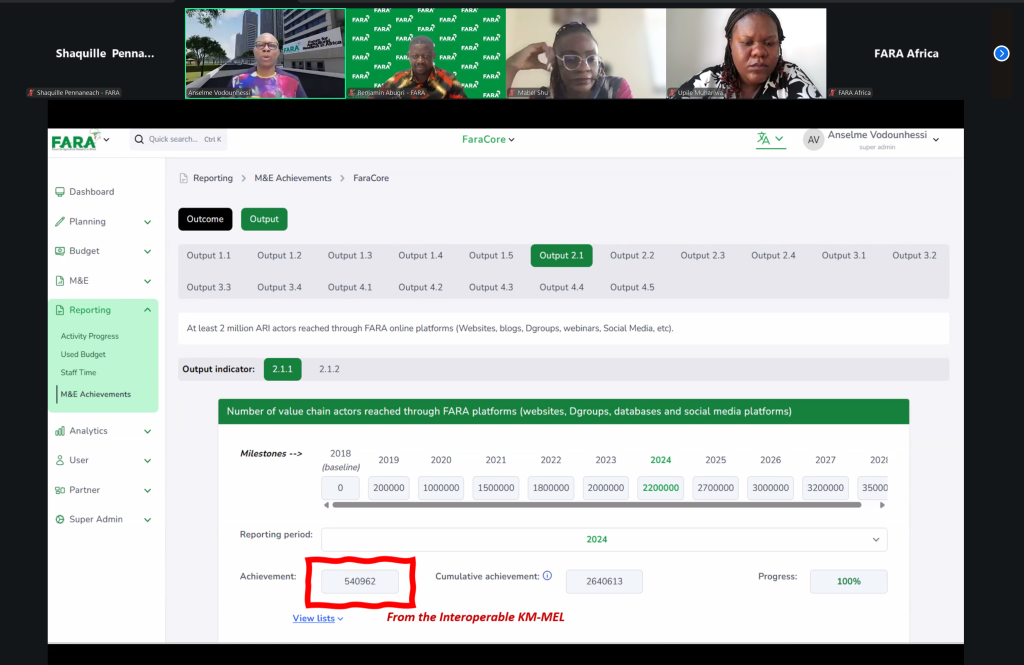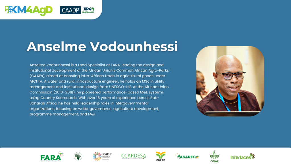 The core presentation was delivered by Anselme Vodounhessi, Lead Specialist for Monitoring, Evaluation and Learning and CAAPs Programme Coordinator at FARA. Drawing on over 18 years of experience across Sub-Saharan Africa, Anselme provided practical insights into how KM interventions can be systematically linked to results frameworks.