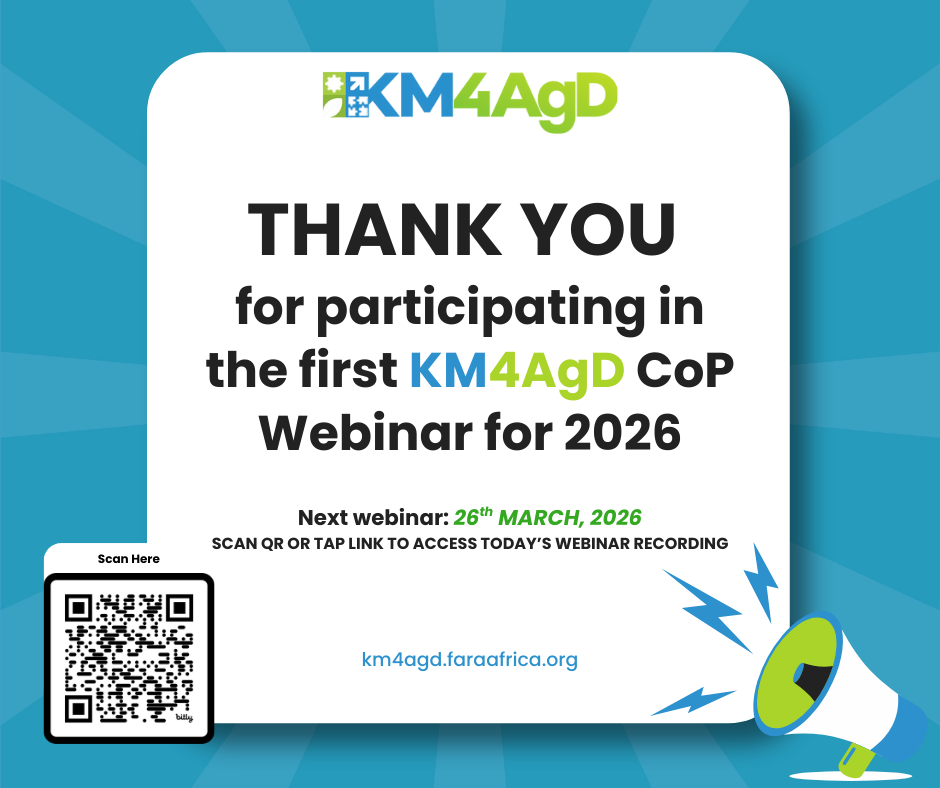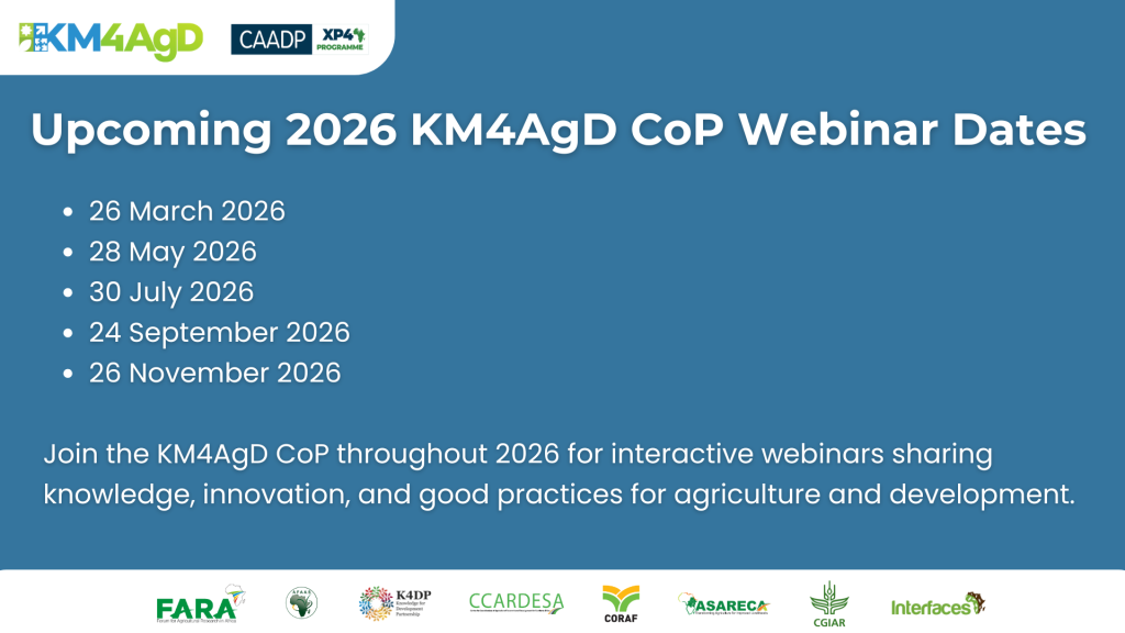 Building on the momentum of this first 2026 session, the KM4AgD Community of Practice will continue to convene bi-monthly interactive webinars throughout the year. The upcoming sessions are scheduled for 26 March, 28 May, 30 July, 24 September, and 26 November 2026. These webinars will provide ongoing opportunities for practitioners, policymakers, researchers, and development partners to exchange knowledge, explore innovative approaches, and share good practices that strengthen agricultural development and evidence-informed decision-making across Africa.