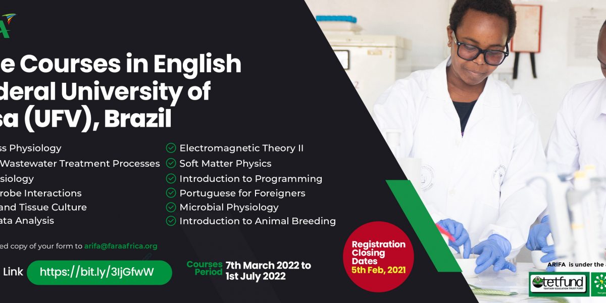 The Forum for Agricultural Research in Africa (FARA), in collaboration with the Universidade Federal de Viçosa (UFV) in Brazil, invites submissions from interested African scientists to teach non-degree, virtual mobility online courses in English through UFV. This program is a component of FARA’s Holistic Empowerment for Livelihoods Program’s mobility component (HELP). This Program is funded by the Tertiary Education Trust Fund (TETFund) When? March 7 – July 1, 2022(most courses, see exceptions below) Who is eligible? “Academic mobility”: undergraduate, Master’s or Ph.D. students currently enrolled in any Higher Education Institution. “Diploma holders”: individuals holding a bachelor’s degree granted by any Higher Education Institution. Steps for the application process: Before February 5,